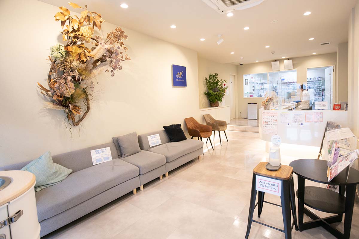 処方箋調剤に加え、美容相談やコスメ販売、薬膳セラピストによる食のアドバイスなど、従来の調剤薬局とは異なる特徴的なサービスや取り組みで、患者さんの健康や美容の悩みに対応。優雅さを感じさせるオブジェや花で彩られた待合室はサロンのような佇まいで、地域でも一際存在感を発揮しています。