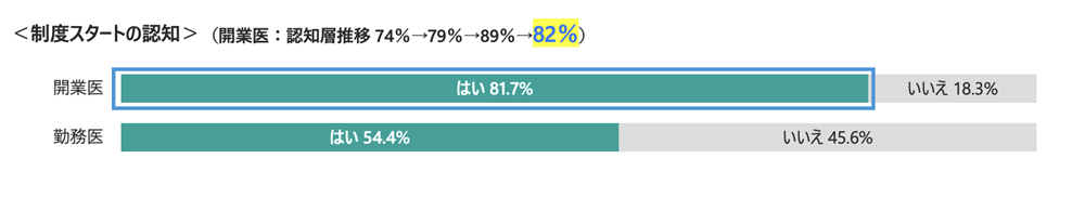 今回の調査結果では、開業医の電子処方箋制度スタートに対する認知度は82%、勤務医は54.4%という結果になりました。