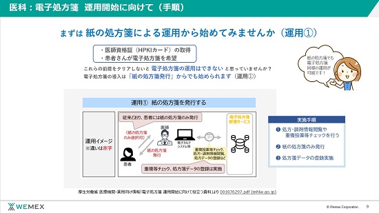 ※今後の電子処方箋の厚生労働省による仕様の進捗により、内容が変わる場合はございます。 出典:厚生労働省ホームページ(https://www.mhlw.go.jp/stf/denshishohousen.html) 電子処方箋ページ(厚生労働省)(https://www.mhlw.go.jp/stf/denshishohousen.html)の内容をもとに、ウィーメックス株式会社で独自に解釈、編集したものです。