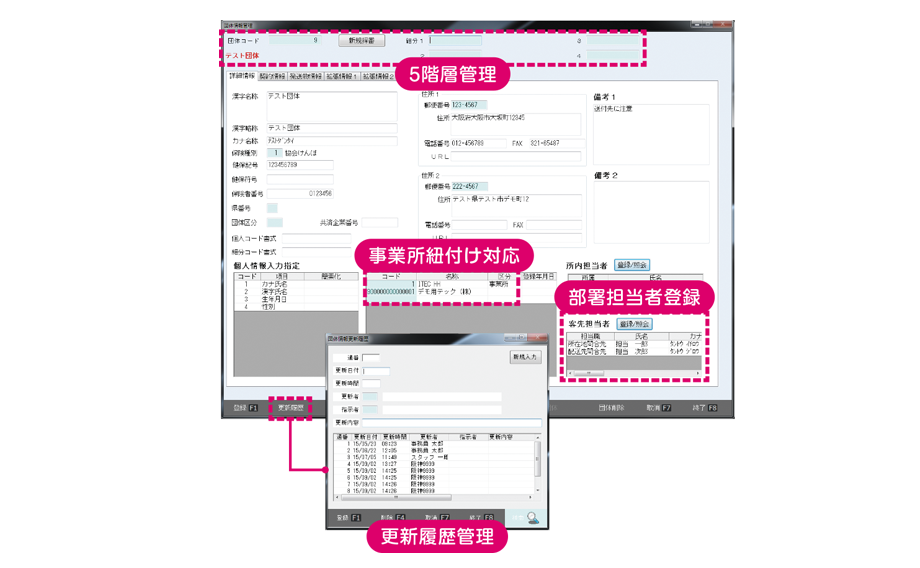 - 関連事業所(事務所のグルーピング)機能により、関連事務所毎の発送・請求・集計などが可能です。
