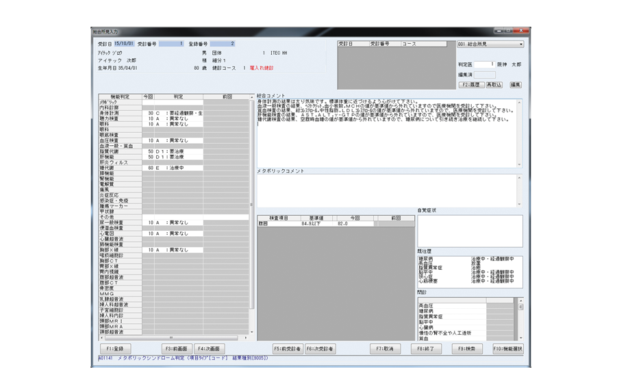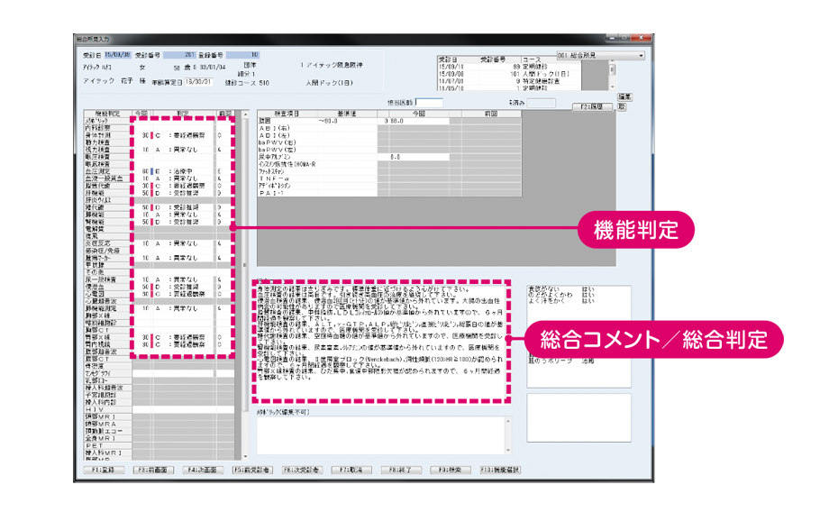 - 一画面上で判定、検査値、総合コメント、問診等が参照でき、総合的に結果が把握可能です。判定の修正や総合コメントも本画面で編集可能です。