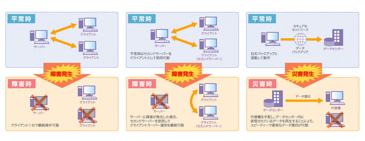 万が一サーバーにトラブルが発生しても、クライアント1台は継続操作が可能です。