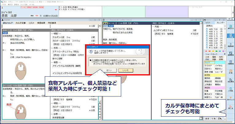 食物アレルギーや個人禁忌、相互作用・副作用・重複投与は、カルテに処方内容を入力した瞬間にチェックが可能です。情報の見落としを防ぐようメディコムがサポートします。