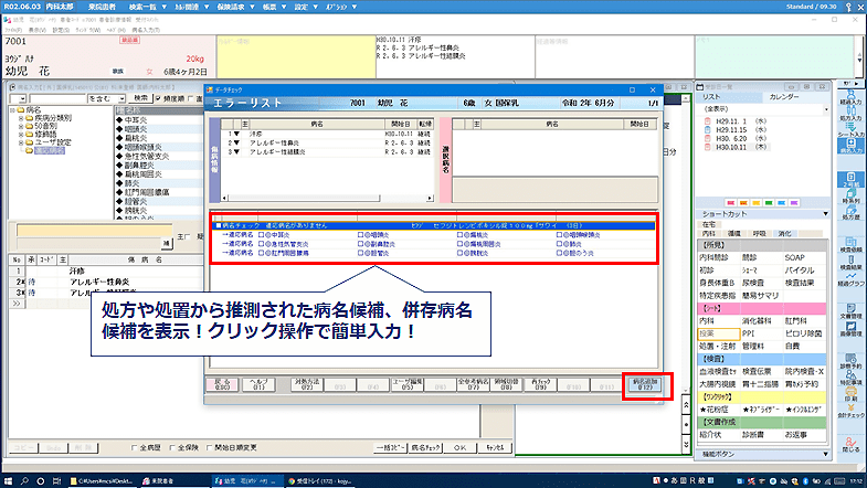 クリック操作で簡単に選択・入力ができ、病名の漏れによる返戻・査定を防ぎます。