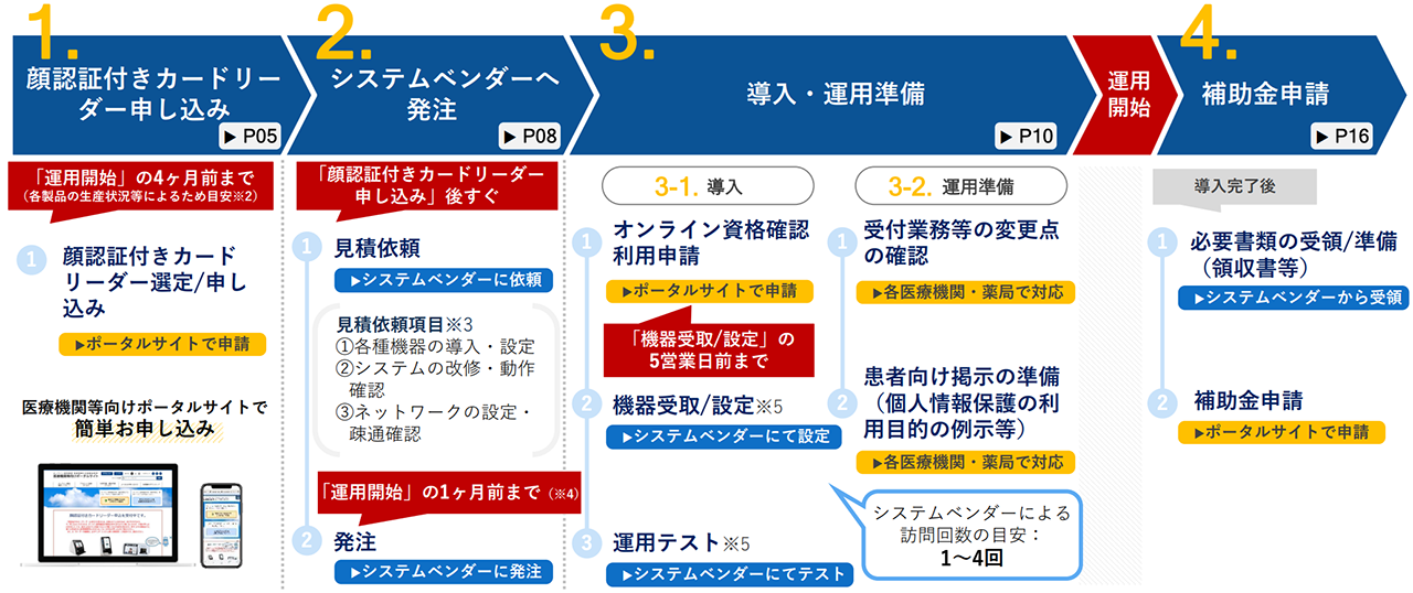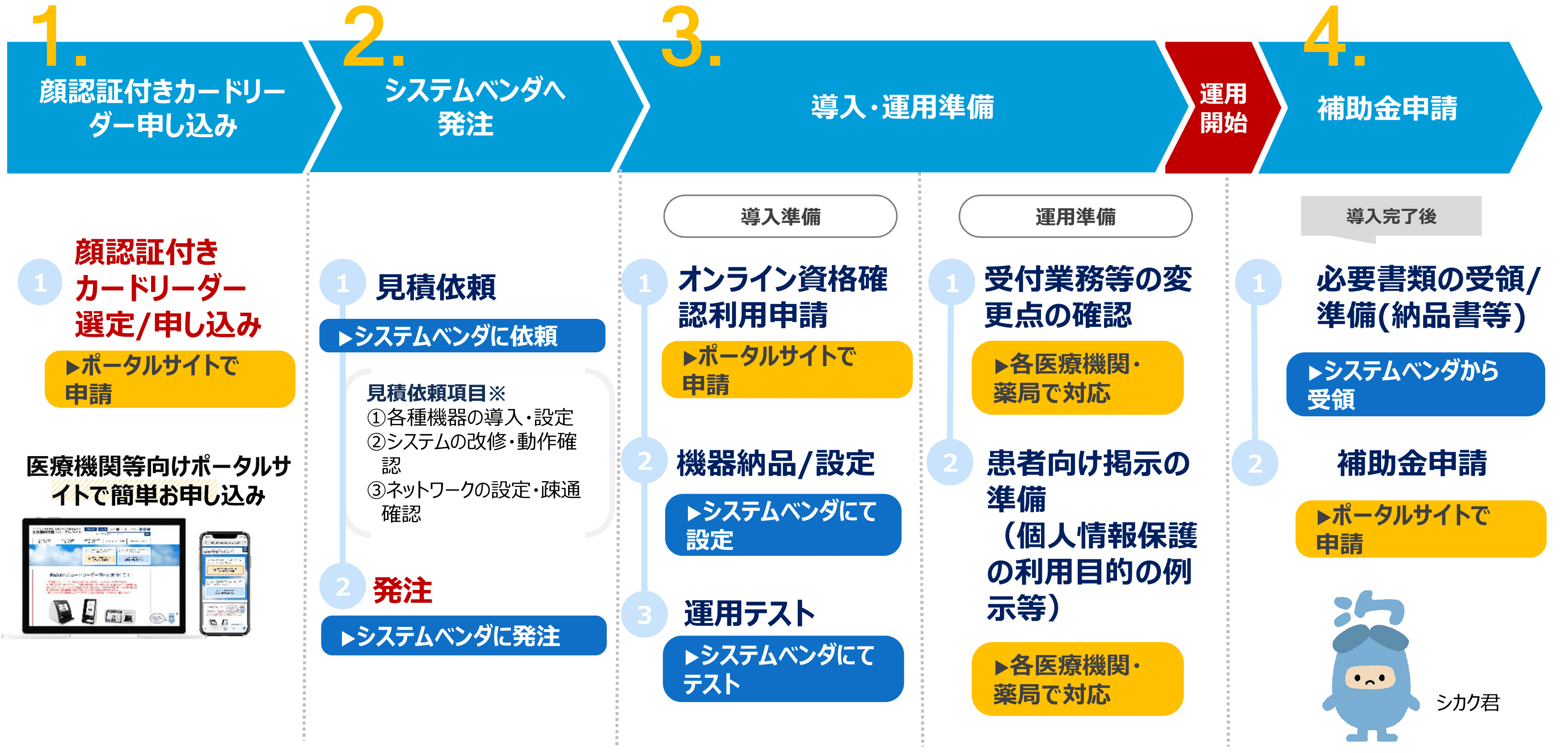 顔認証付きカードリーダーの提供や、システムベンダ(現在ご利用のレセプトコンピュータ等の業者)の現地作業までに期間を要するため、お早めにポータルサイトでのお申し込み/システムベンダへの発注をお願いいたします。