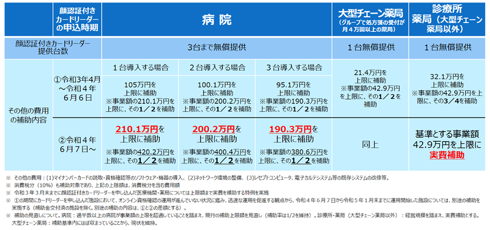 - 顔認証付きカードリーダーの申込時期が令和4年6月7日から令和4年12月末まで、かつ、令和5年2月末までにシステム事業者との契約を結んだ医療機関・薬局が対象です。