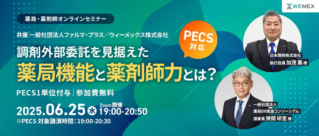 そこで今回は外部委託を推進され、昨年度の弊社セミナーでのご講演も大反響をいただいた一般社団法人薬局DX推進コンソーシアム 理事長 狭間様と、日本調剤株式会社 執行役員 加茂様にご登壇いただきます。特区大阪では異なる法人間における外部委託の実証実験も行われました。そこから見えた成果や課題、さらに外部委託が普及した際に期待される薬局機能や薬剤師の役割について、現在取り組まれていることも含めながらもお話を伺います。
