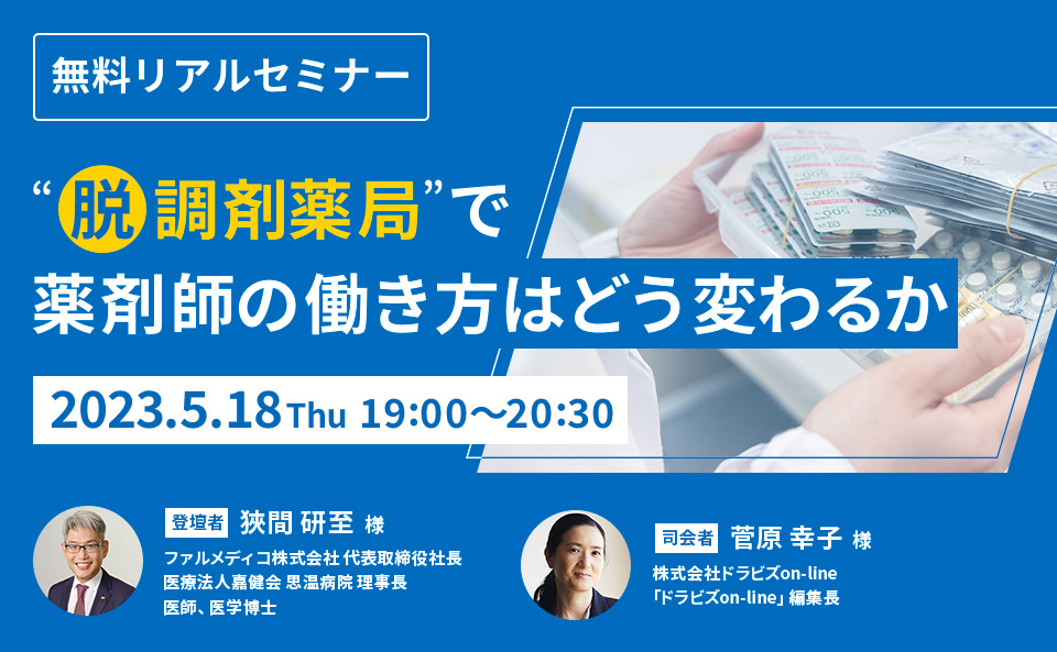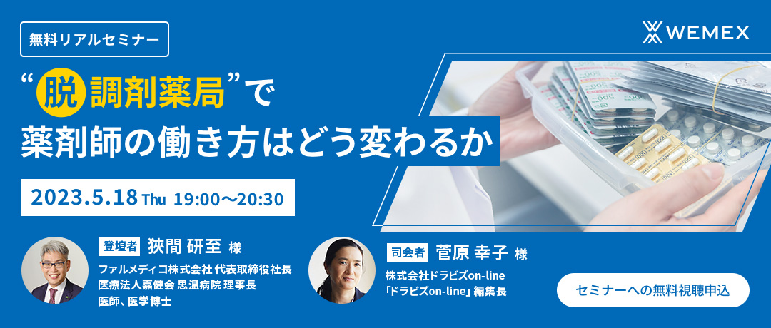 本セミナーでは、狭間氏のこれまでの取り組みや昨今の政策動向への見解、薬局DXの導入事例などを交えつつ、「“脱調剤薬局”で薬剤師の働き方はどう変わるか」についてご講演いただきます。