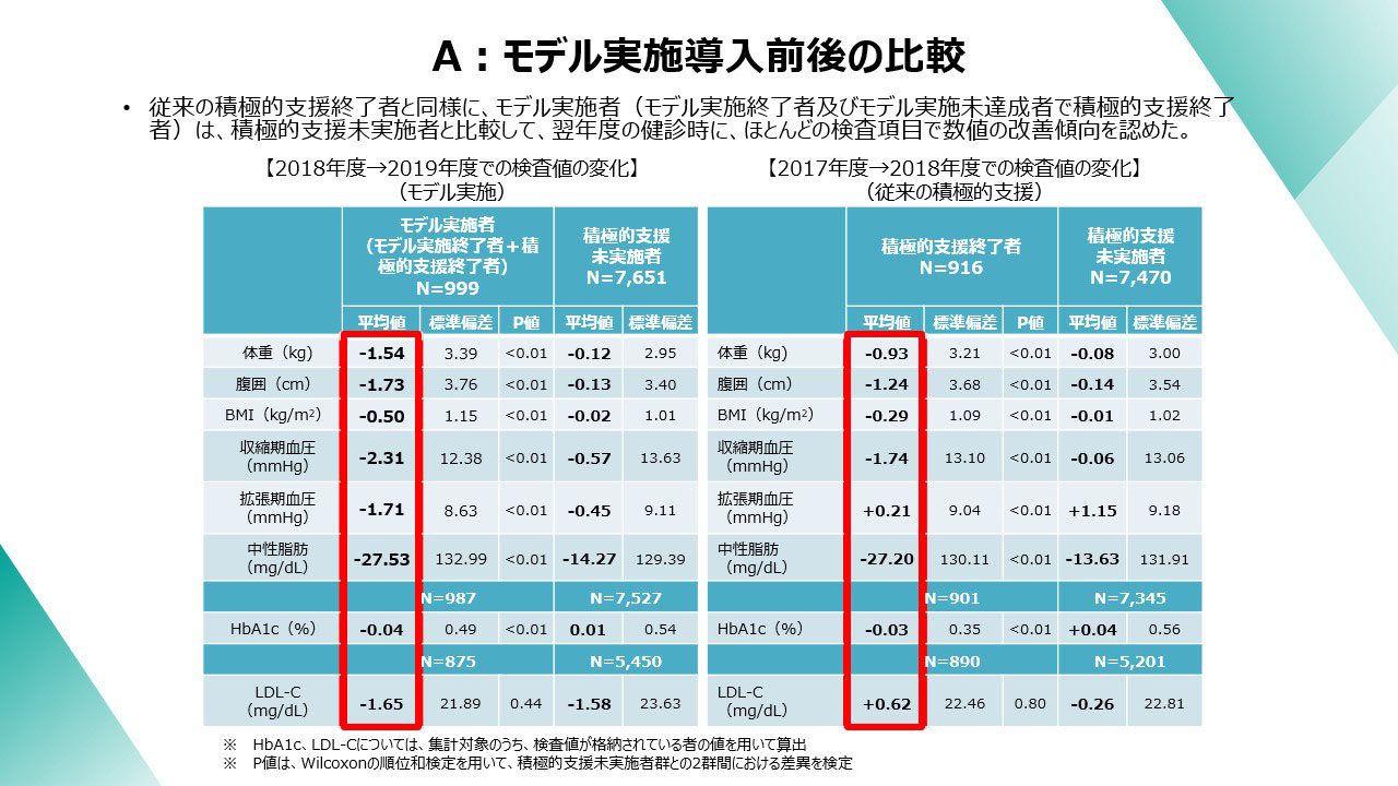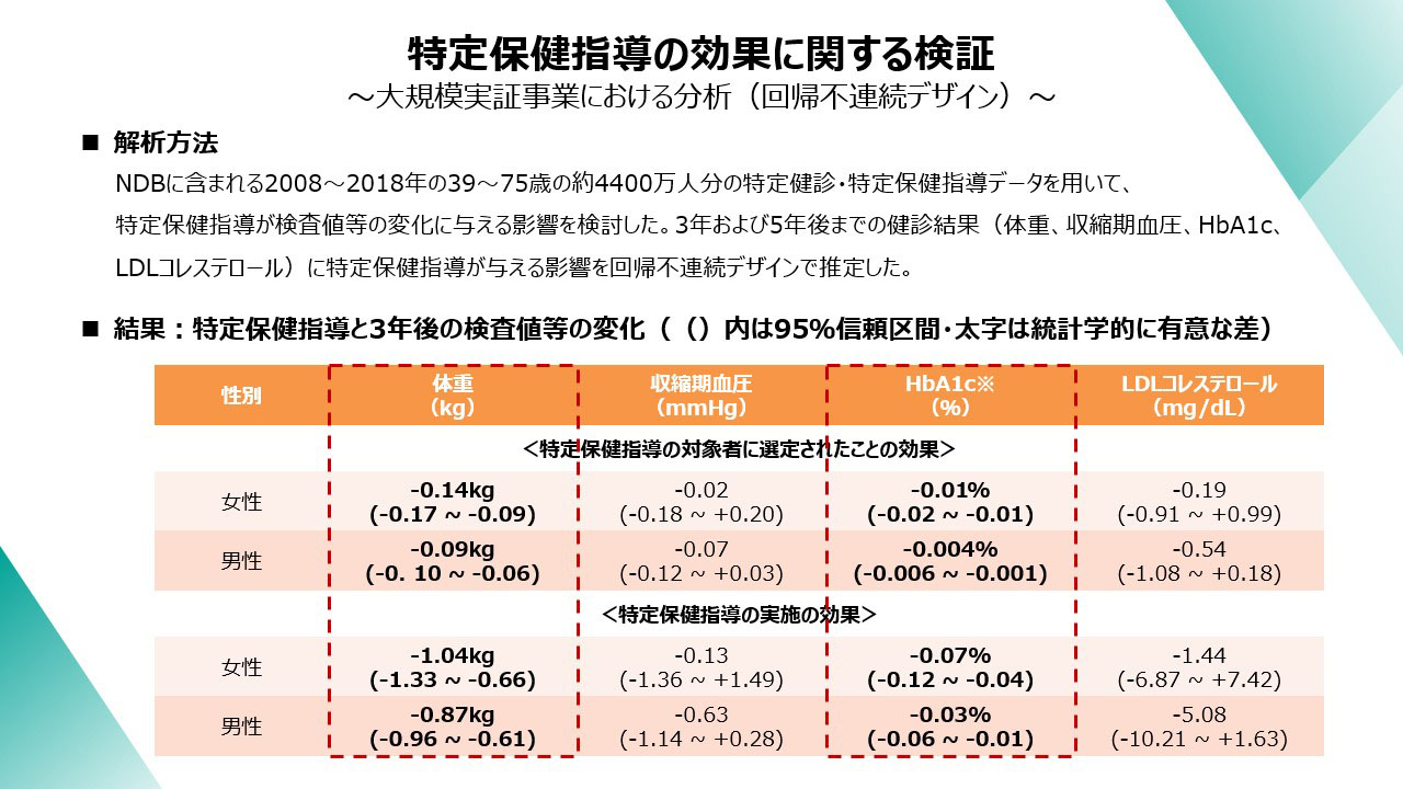 大規模実証事業においても、保健指導参加により体重、腹囲、HbA1cに有意な効果を認めることが示されています。