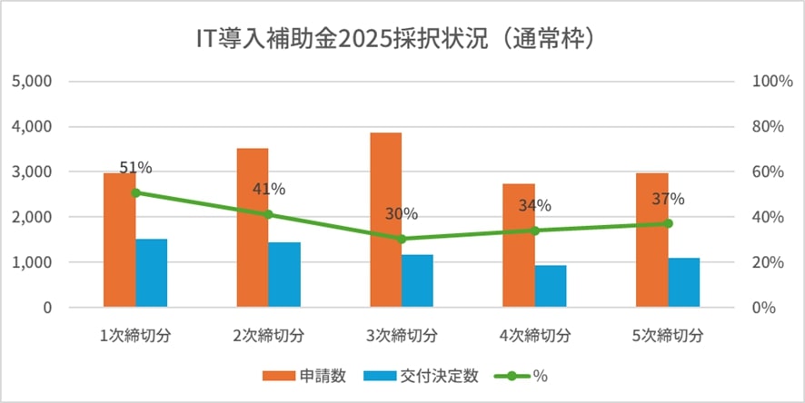 補助金は、申請すれば必ず受給できるものではありません。IT導入補助金2025の採択状況を確認すると30%から50%の値で推移していることがわかります。