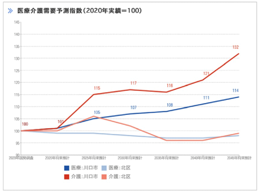 医師の偏在でクリニックが不足するのは、過疎地だけではありません。首都圏でも東京への通勤圏の埼玉・千葉県には、診療科によっては都内と比べて人口あたりのクリニック数が少ない地域があります。例えば、埼玉県川口市は隣接する東京都北区に比べて、今後も医療需要の伸びが見込まれますが、2020年現在で人口10万人あたりの内科クリニック数は北区の6割に過ぎません。詳しい診療圏調査をコンサルタントに依頼する前にざっくり開業エリアを検討するのに利用されてはいかがでしょうか?