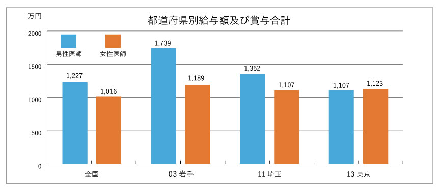 都道府県別・男女別の医師の収入を見ると女性はあまり差がありませんが、東京都の男性医師は全国平均より低く隣の埼玉県とも大きく差がついています。さらに医師の不足する岩手県と比べると1.6倍の差があります。