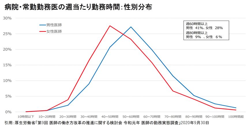 厚生労働省の2019年の調査によると、「病院・常勤勤務医」の場合、男性医師の41%、女性医師の28%は1週間の労働時間が60時間を超えています。