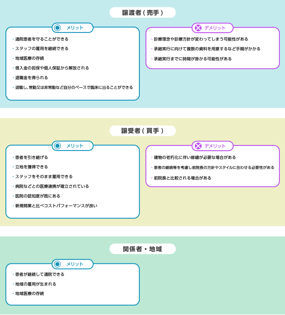 また、譲渡に対する対価を受け取れることや、退職後もその後自身のペースで臨床に出ることができるなど多角的に多くのメリットを得ることができる。