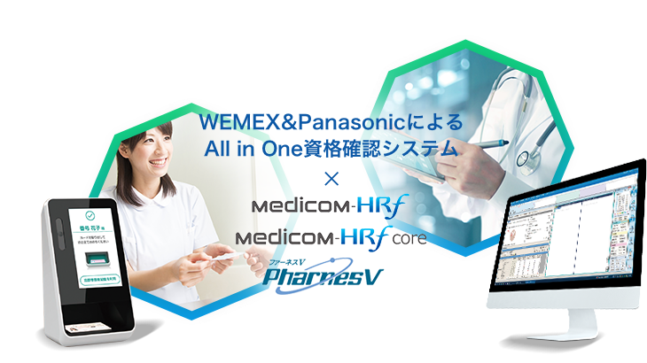 パナソニック コネクト株式会社が提供する顔認証付きカードリーダーとウィーメックス(旧PHC)/PharnesVシリーズのレセコン端末(クリニック向け、薬局向け)との一体化で、省スペース化が可能になります。さらに相互連携機能を導入し医療現場での使いやすさを追求します。