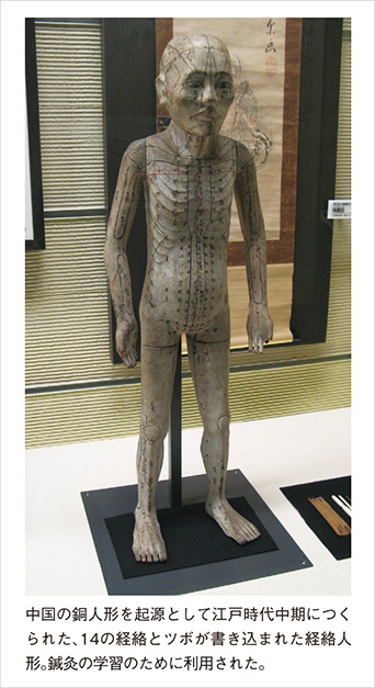 そういった学校の怪談話の定番でもある教材用人体模型は、日本では1600年ごろ紀伊藩医の岩田道雪(いわたどうせつ)によって初めて製作されたといわれている。その全長は約80㎝で、材質は木製。当時の鍼灸治療の教材に用いるため、白漆喰で仕上げた上塗りの表面に、全身の経絡とツボを墨で記入した。室町時代に中国に渡り医術を学んでいた竹田昌慶(たけだしょうけい)が、帰国の際に王室からもらいうけた銅人形がこの人形のベースになったという。洪武帝后の難産を助けたことで名声を博した昌慶が、1378年に多くの医書などとともに日本に持ち帰った銅人形には経絡やツボが刻まれ、ツボに鍼が的中すると水銀が出る仕掛けになっていた。それにヒントを得て、独自のアレンジを加えてつくられた道雪の経絡・ツボ人形は、わかりやすさから江戸時代の鍼灸医たちのあいだで評判となった。