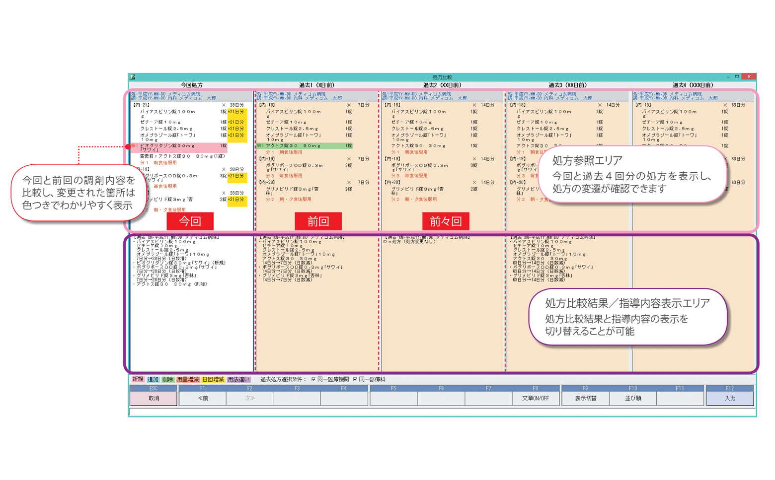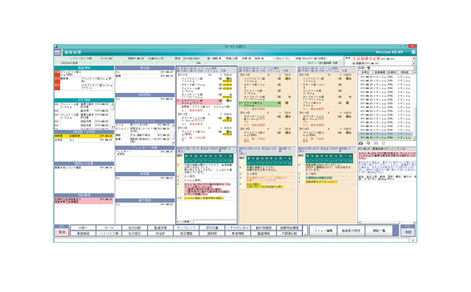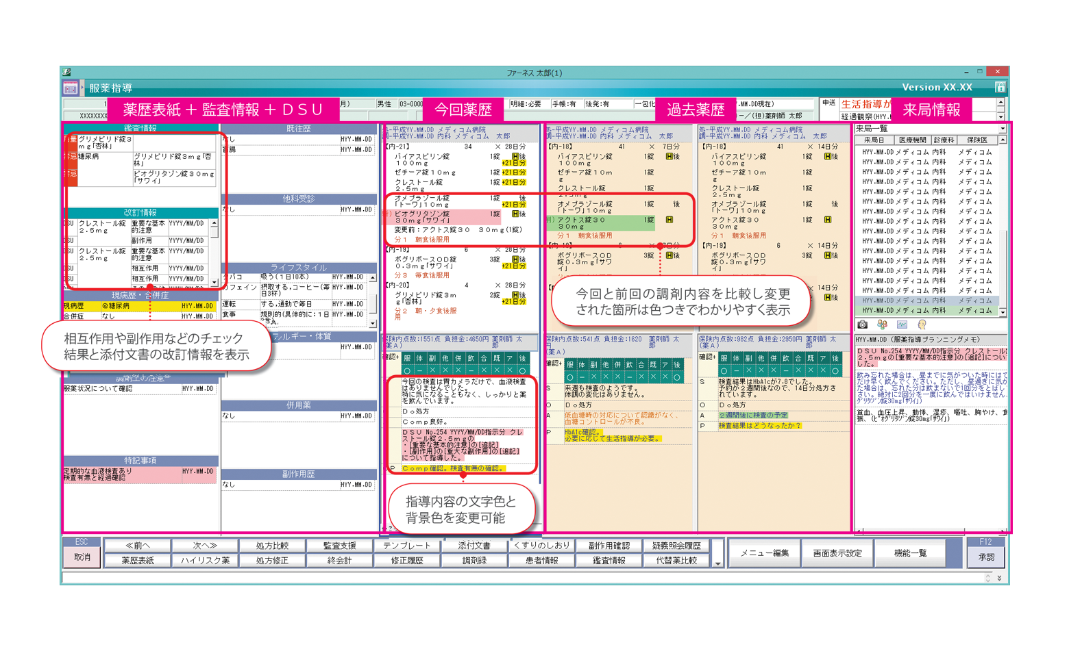 処方監査に必要な患者さんの情報を、画面の切り替えなしで一画面に並べて確認できます。また、要チェック項目はカラー表示されるので、正確でスピーディーな処方監査、薬歴作成が可能となります。