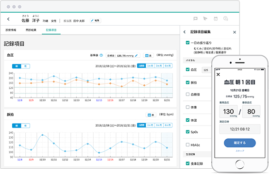 患者さんは、疾患に合わせて治療に必要な項目を自分で管理して記録。医師は患者さんの状態変化を継時的に捉えることができます。