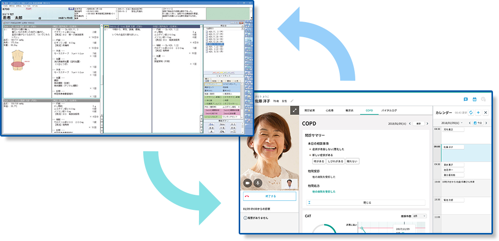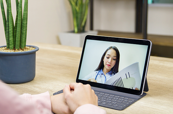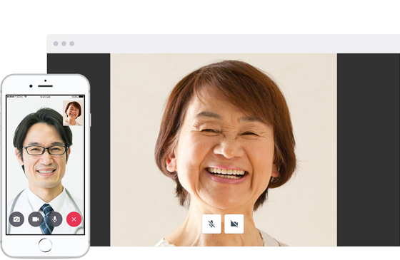 予約時刻を目安に医師が発信。医師は患者さんと離れていても、患者さんの表情や状態を見て診察ができます。