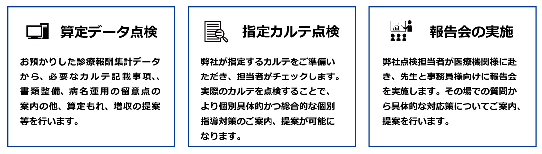 お預かりした診療報酬集計データから、必要なカルテ記載事項、書類整備、病名運用の留意点の案内の他、算定もれ、増収の提案等を行います。