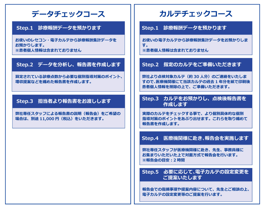 - 当該サービスのデータチェックコースは、報告書の作成・お渡しまで、カルテチェックコースはさらに報告会の実施までがサービス内容となっております。実際の個別指導における書類の準備、電子カルテの整備等の作業自体のサポートは行っておりません。予めご了承ください。