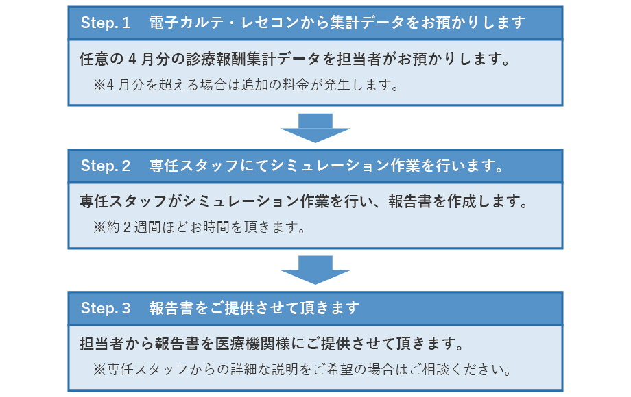 - こちらのサービスは、お使いのレセコン・電子カルテのデータ(集計データ)を活用してシミュレーションを行うものです。個人情報の収集は行いません。