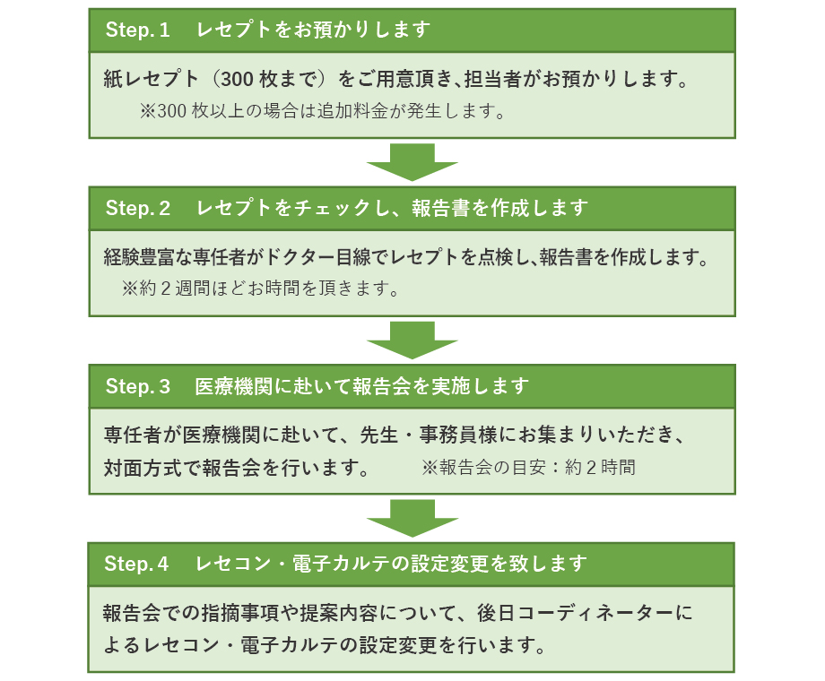 レセプト点検サービス 「レセプトEye」の工程は直接医療機関様のレセプトを点検し、専任スタッフが医療機関様に赴いて報告会を実施します。また報告会後はメディコムコーディネーターによるレセコン・電子カルテの設定変更で、医療機関様の保険請求業務の効率化をお手伝いいたします。
