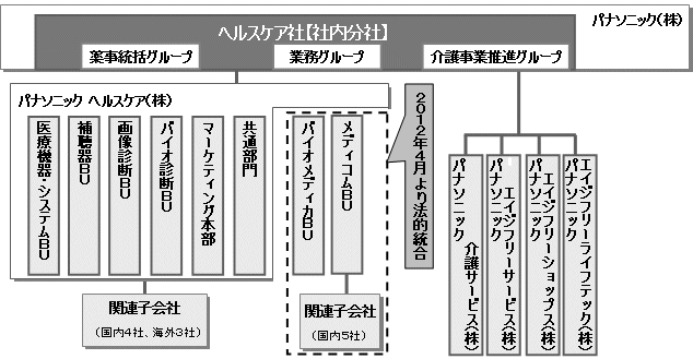 まず、2012年1月にパナソニック株式会社の新たな社内分社としてヘルスケア社が設立され、その傘下にパナソニック ヘルスケア株式会社(社長:山根 健司)、三洋電機株式会社(社長:佐野 精一郎)のバイオメディカ事業およびメディコム事業、加えてパナソニック電工株式会社のエイジフリー事業とパナソニック介護サービス株式会社がヘルスケア傘下に位置づけられます。