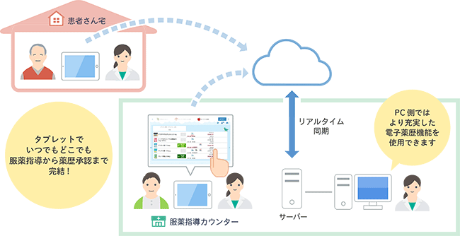 「DrugstarLead クラウド薬歴」は、オンプレミス(*2)型保険薬局用電子薬歴システム「PharnesV-MX(*3)」および「DrugstarPrime2(*4)」に搭載し、タブレットなどのモバイル端末を用いて、服薬指導から薬歴承認まで、薬歴に関係する一連の業務を効率的に完結できる、オンプレミスとクラウドのハイブリッド型システムを搭載する対面型薬剤情報システムです。クラウドサーバーと薬局内サーバーとがリアルタイムで同期することで、最新の患者さんの薬歴データが常時双方に複製保存されるため、いつでもどこでも、薬歴情報の参照や入力作業が可能です。これにより、薬剤師の業務効率の向上と、在宅医療を含め、患者さんへの医療サービスの充実を図ります。