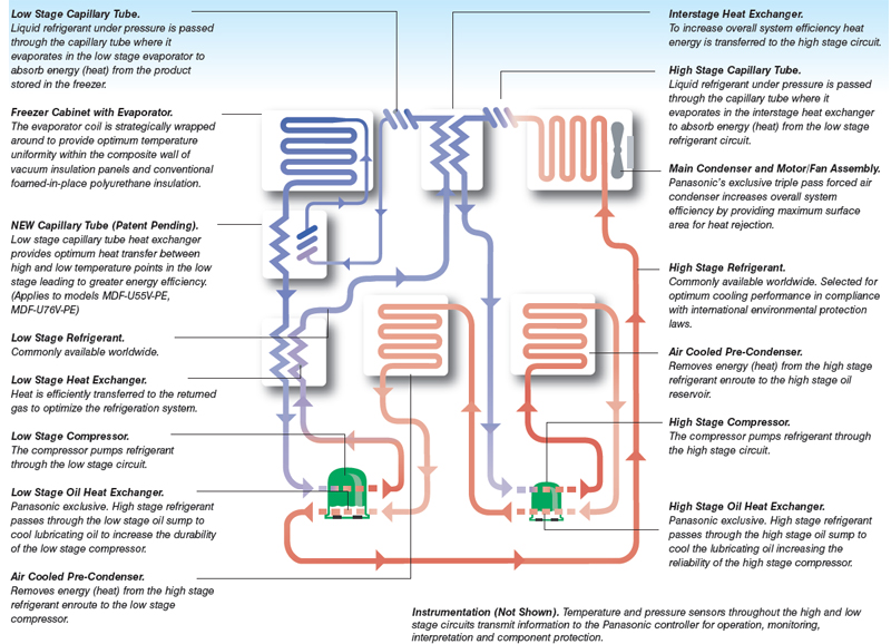 Jedną z najważniejszych kwestii w projektowaniu energooszczędnej zamrażarki niskotemperaturowej jest wydajność wymiany ciepła pomiędzy układami wysokiego i niskiego stopnia. Zapewnienie optymalnych szlaków wymiany ciepła w konstrukcji nie tylko poprawia wydajność systemu, prowadząc do większej oszczędności energii, ale również zmniejsza obciążenie sprężarek, co zapewnia większą niezawodność całego systemu. Nowy wymiennik ciepła z rurkami o strukturze kapilarnej firmy PHCbi to najnowsza metoda zwiększania dostępnych obszarów wymiany ciepła w systemie. To innowacyjne rozwiązanie, które oczekuje na przyznanie patentu, w istotnym stopniu zwiększa wydajność całego systemu. Końcowym rezultatem jest mniejsze zużycie energii przy równoczesnej poprawie wydajności całej zamrażarki.