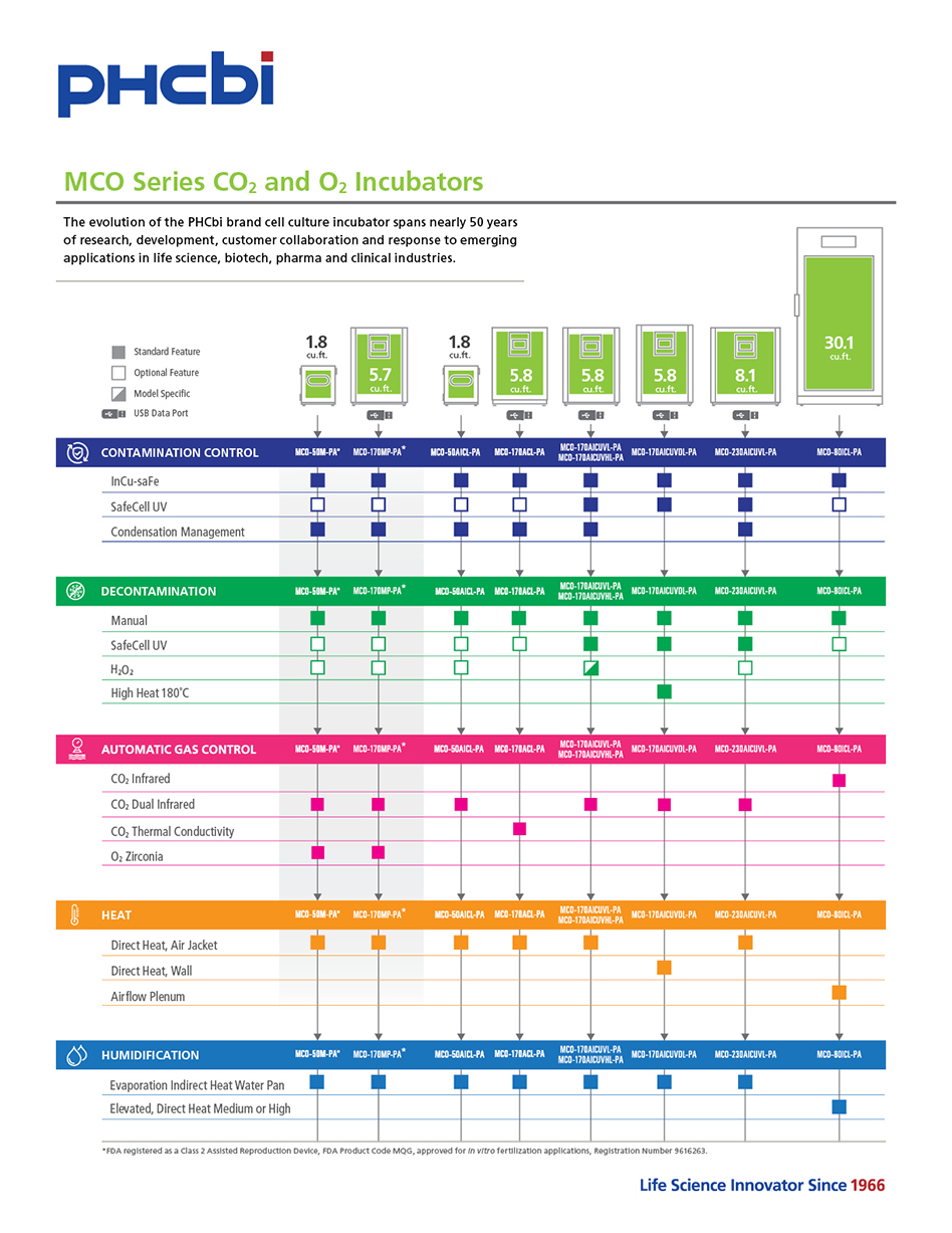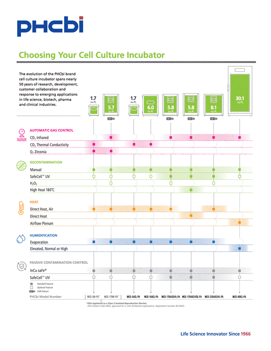 PHCbi brand CO2 and multigas CO2/O2 incubators represent generations of successful product development in response to emerging cell culture protocols used around the world. Our incubators use innovative technology to fulfill a wide range of applications. Download our product brochure to learn more.