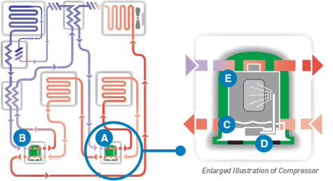 Compressors in the Panasonic cascade refrigeration system run cooler than compressors not designed for ultra-low temperature applications. By using the same energy twice, the Panasonic system borrows refrigerant flow from the high-stage circuit (A), looping it through both compressor reservoirs (C) to cool the lubricating oil and extend compressor life.