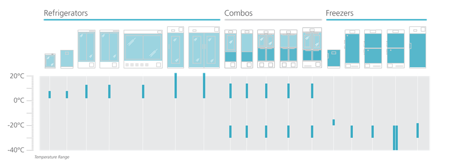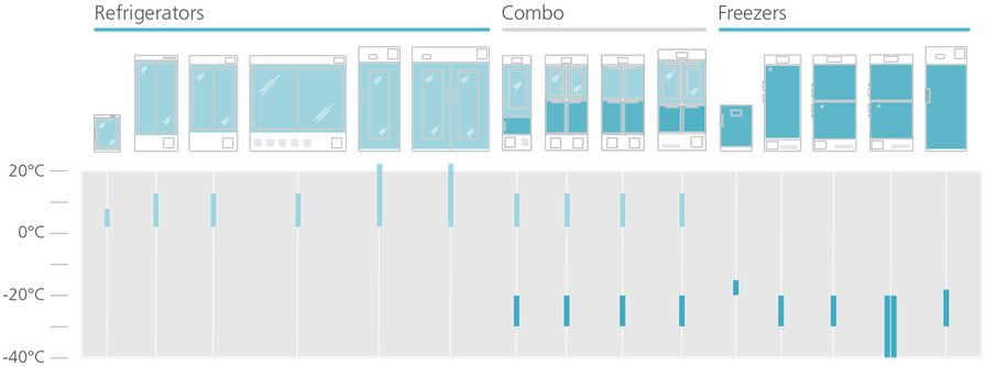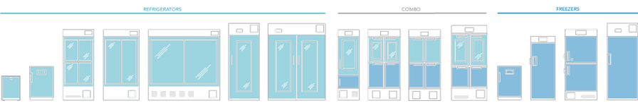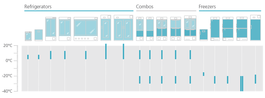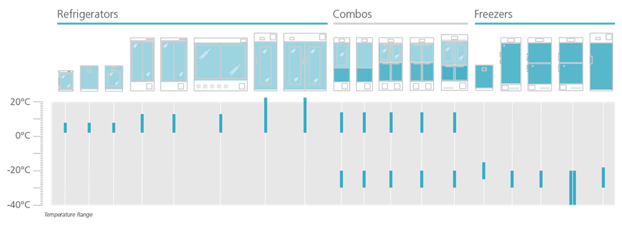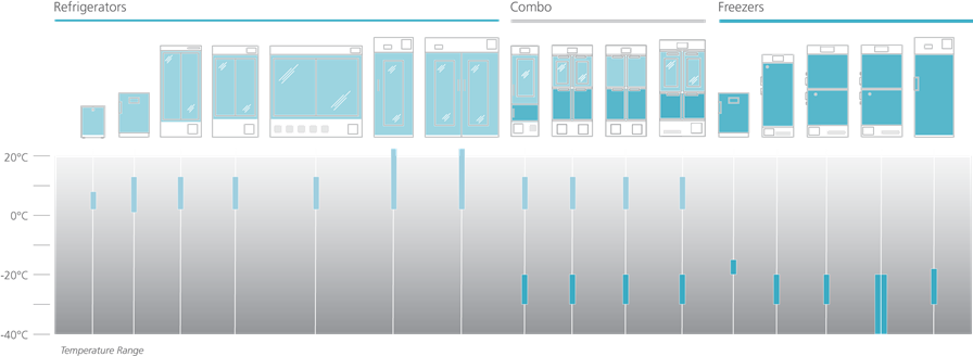 PHCbi refrigerators, freezers and combo refrigerators/freezers are available in a range of cabinet sizes and operating temperatures. This graphic index illustrates the relationship among the high performance product family.