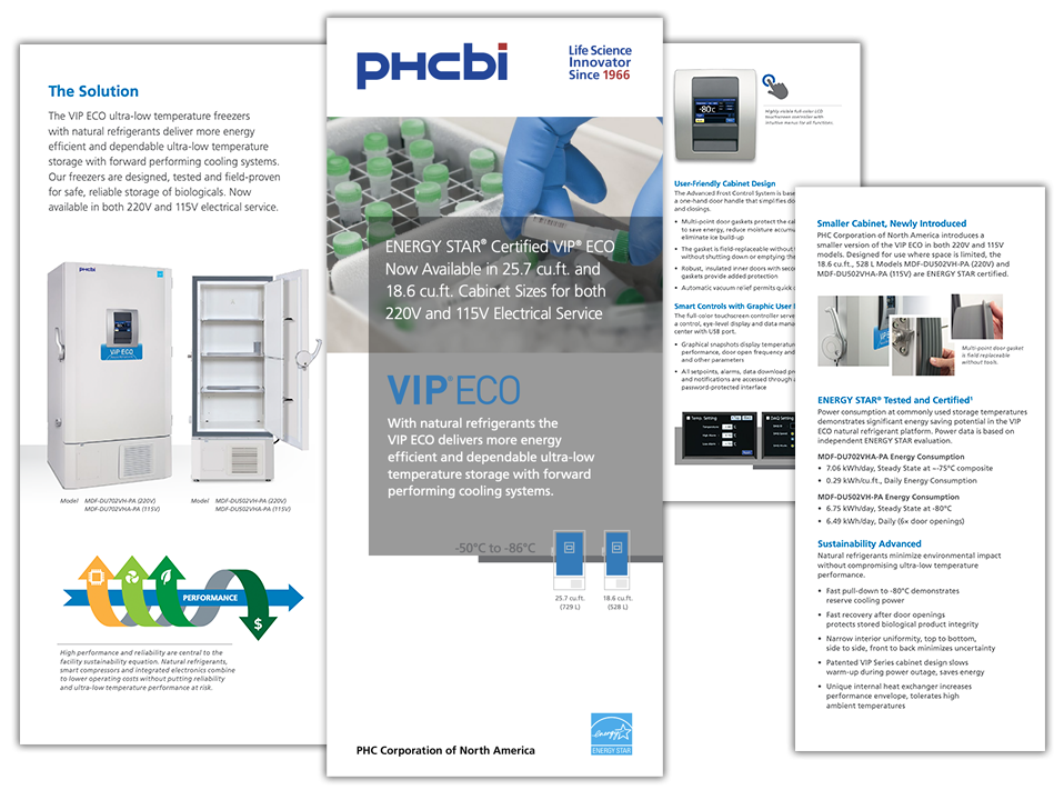 The VIP ECO ultra-low temperature freezer product line is designed, tested, and field-proven for safe, reliable storage of biologicals, vaccines, and high value samples. The VIP ECO has earned ENERGY STAR® Certification and customer satisfaction thanks to performance, reliability, energy savings, and operation. The latest model to join the VIP ECO Series lineup builds upon a history of excellence and years of research and PHCbi brand engineering innovations. The new VIP ECO SMART continues a tradition of performance and reliability while leading the ENERGY STAR ULT category. The VIP ECO SMART is our most advanced ULT to date, using 30% less energy than other leading ENERGY STAR Certified freezers in its class. i